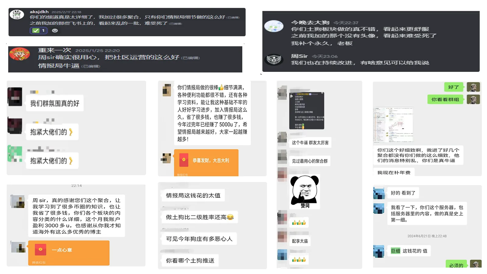情报局最大的财富不是拥有多少博主,而是我们拥有众多愿意为大家倾囊相授,分享经验的群友,良好的社区氛围是我们众多会员愿意长期选择我们的重要理由,在这里你可以看到老韭菜的每日行分析,和群友给自己定下目标并为之挑战的记录,也有记录自己的毛日记,不管你参与加密货币哪个板块都能在这里找到志同道合的朋友。